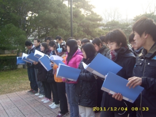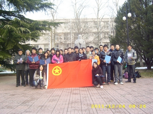 2011年12月4日星期日清晨8:00,06110902团支部在中心花园孔子塑像前举办了名为“清晨之约”的主题团日活动,旨在发扬老区人民艰苦奋斗精神,在清晨严寒中砺炼意志。活动以宣传党史校史为主要内容,同时结合同学们自身的兴趣爱好发掘同学们对生活的热情。