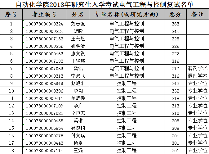 自动化学院2018年研究生入学考试复试名单